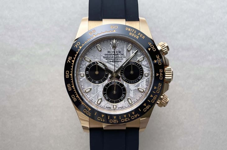 116518LN-0076以黃金打造,搭配Oysterflex橡膠表帶以及隕石面盤,無論就視覺上或佩戴感受上都有其令人愛不釋手的原因。 勞力士用來制作面盤的隕石主要成分為鐵和鎳,這種金屬隕石材質在表壇中不常見的原因在于它的加工難度相對高,而且其外觀富有交錯紋理,這些都是隨著時間慢慢累積形成,因此品牌加工時并不需刻意在面盤加上其他紋路裝飾,或許阿卡瑞茲就是對這種來自天外的元素特別感興趣,因此即使它已經退出品牌的現役產品陣容中, 小蠻牛還是相當樂意在自己贏下大滿貫冠軍的重要場合上戴著它共享榮耀。 表款在停產前的定價約114萬,但是根據外媒Superwatchman的數據,這款表目前市值可達80,000美金(約合臺幣259萬),絕版加上面盤的珍稀性使其二手市場價值還是維持在高檔,溢價率超過100%,可是以阿卡瑞茲現在如日中天的地位,他應該是純粹出于個人喜好而非因為手表的行情才選戴這只表。