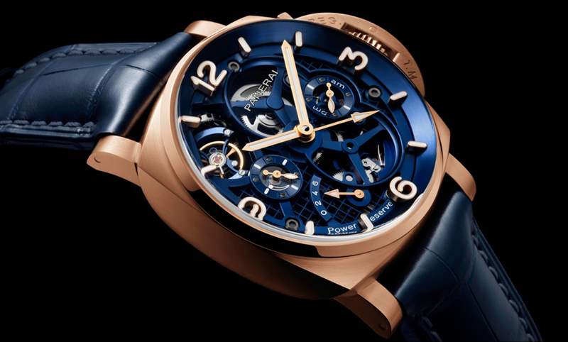 PAM01060延續前作的鏤空面盤設計,可透視面盤直接細品機芯運作。另一方面,將前作的表圈設計移除,阿拉伯數字和棒狀時標直接置于表鏡邊緣,并將時標放大、增加立體感,整體表盤空間更大、也更清晰易讀。動力儲存顯示設置于面盤9點鐘位置,兩地時間指示設于3點鐘位置,陀飛輪則設置在10點與11點鐘之間。