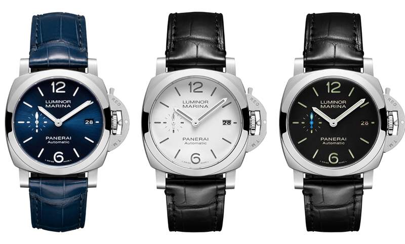 Luminor Marina Quaranta腕表將取代42毫米表款,成為L(zhǎng)uminor Marina現(xiàn)行表款中尺寸最小的款式。三款腕表皆采用精鋼表殼,并根據(jù)各自的表盤設(shè)計(jì),搭配不同的鱷魚皮表帶和小牛皮表帶。其中,PAM01271是白色啞光表盤搭配黑色鱷魚皮表帶和深棕色小牛皮表帶,PAM01272是黑色啞光表盤搭配黑色鱷魚皮表帶和黑色小牛皮表帶,PAM01270是藍(lán)色太陽(yáng)放射紋表盤則搭配深藍(lán)色鱷魚皮表帶,并另備煙草色小牛皮表帶。