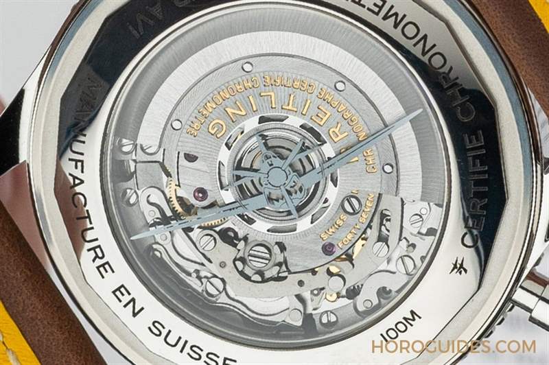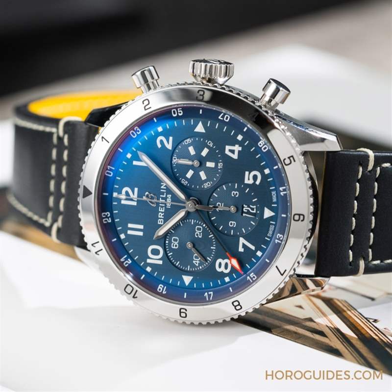 搭載的B04機芯是以百年靈看家的B01自制計時機芯為基礎加裝GMT模組,由于B01向來以穩定耐操、在中價位屬于性價比極高的計時機芯而聞名,所以B04自然也值得信賴。在擺輪旁邊可以看到擒縱輪也加裝了避震器,有助于提升防震耐用度,另外配備垂直離合、導柱輪裝置,并通過COSC天文臺認證,因此精準度達到每日誤差在-4到+6秒之間。而計時按把的手感回饋也非常明確到位,按壓的深度扎實又很流暢,操作起來絕對大大滿足戴表的互動感。