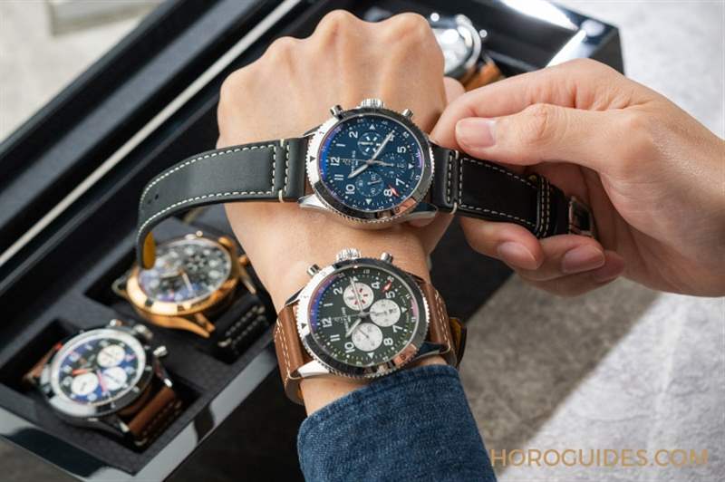 繼承「Co-Pilot」AVI Ref. 765的設計,「AVI」系列的一大特色,就是3點鐘位置的30分鐘計時盤,每5分鐘就有一條粗體夜光刻度,更有利于判讀;表款上也能看到飛行表的經典元素:大型阿拉伯數字夜光時標,并擁有計時碼表以及兩地時間功能。為了搭配46毫米大表徑,表帶是手感相當厚實的小牛皮表帶,表面的對比色縫線呼應早期皮革飛行裝備的線縫,很有軍用品的味道。