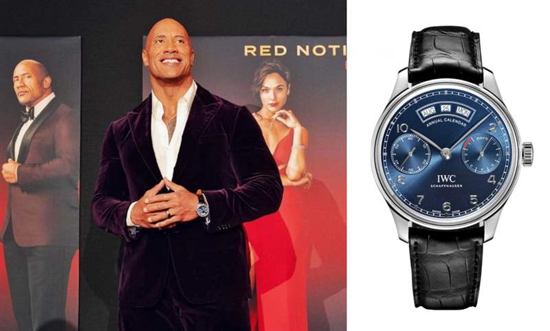 最近他出席主演的Netflix網飛2021年卡司大片《紅色通緝令Red Notice》的LA首映會時,以IWC Portugieser Annual Calendar IW503502年歷表搭配深紫色天鵝絨西裝外套與白襯衫,44.2毫米表徑,經典圓殼加上對稱盤面布局,金屬光澤的藍色面盤讓表款既紳士又顯得活潑。