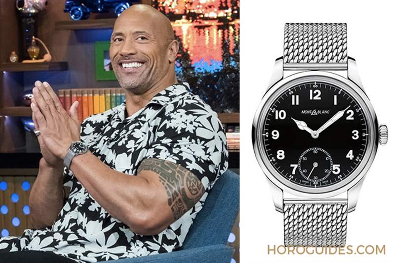 巨石強森也不是只戴運動表,例如2018年他上美國著名脫口秀節目“Watch What Happens Live with Andy Cohen”宣傳新電影《Skyscraper》(摩天大樓/高兇浩劫)時,就戴了一只萬寶龍MONTBLANC的1858小三針,黑色表盤搭配教堂式指針、大型洋蔥表冠與米蘭鏈帶,十足古典風格,44mm的尺寸是源自Minerva古董懷表的大表徑,但之于巨石強森簡直就是一只袖珍的日常表。