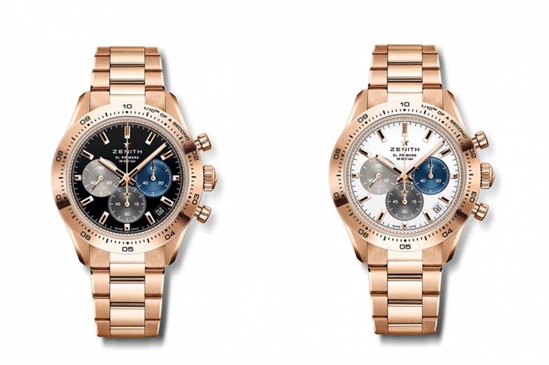 至于去年才面世的Chronomaster Sport系列,甫跟大家見面便取得異常成功,今年Zenith決定為它們換上一身霸氣十足的黃金勝利服裝,就是「金色」。品牌以玫瑰金打造三款不同造型的Chronomaster Sport,分別是全玫瑰金打造表圈、表殼、表帶的黑色表盤或白色表盤兩個設(shè)計;以及玫瑰金與精鋼結(jié)合的雙色款式。換上一身玫瑰金的Chronomaster Sport頓時在活力澎湃的外形下,增添了一份貴氣,再配上Chronomaster標(biāo)志性的三色小表盤設(shè)計,整枚表非常搶眼!