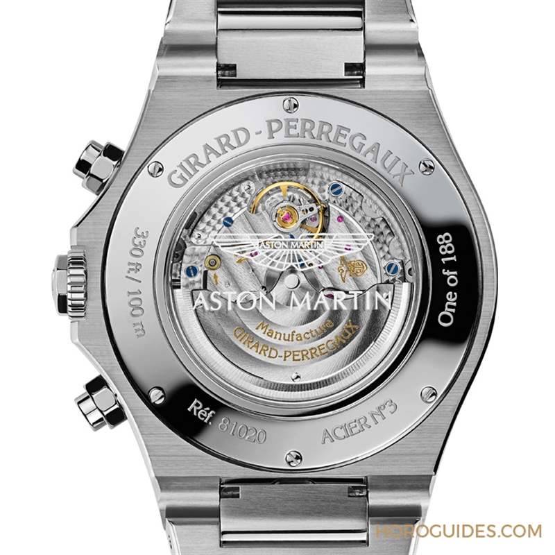 翻到表背,可以發(fā)現(xiàn)桂冠系列計時腕表第一次采用透明底蓋。透過藍(lán)寶石水晶底蓋,可以欣賞到此表款所搭載的GP03300-0141型自制自動上鏈機芯。這枚機芯的設(shè)計是以GP03300機芯為基礎(chǔ),飾有圓環(huán)形、直線形日內(nèi)瓦波紋與珍珠紋;而機芯上所標(biāo)示的老鷹圖案,則提點出這枚機芯是由GP自主打造。