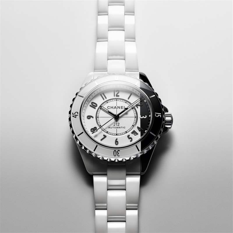 周年紀念作J12 Paradoxe,不再以純黑或純白姿態現身,而是更大膽破格的黑白同體,視覺沖擊極強烈。腕表以黑、白色陶瓷為表殼,左邊雪白,然后Chanel大刀一揮,右邊表耳、表面以至表冠為黑,將J12的黑白世界俐落分割,黑白色比例更不是常見的50:50,