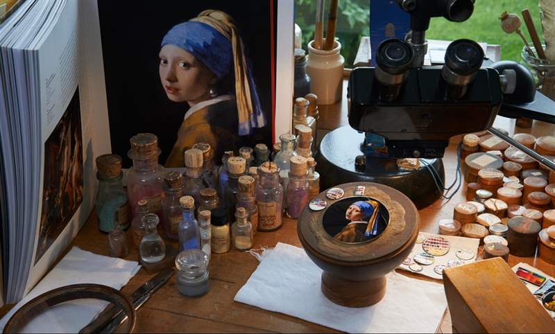 要將精美藝術濃縮于表盤上,需要極為耐心細致,僅僅是在少女的頭巾上填涂一層釉料,就要耗時兩周。為了重現原作微妙的色彩層次,僅黑色就需由七種不同色調的釉料精心調配而成。此外,每上一層釉料便需入爐燒制一次,需在爐內反覆燒制20次左右,才能達到釉彩固色的效果,過程中沒有重新修改調整的機會。整個微繪過程歷時七個月之久。此外,懷表的主表盤采用大明火琺瑯工藝,呈現出溫潤的蛋殼色,與藍色琺瑯羅馬數字時標相映生輝。