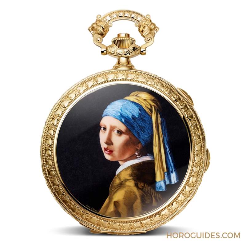 Les Cabinotiers閣樓工匠西敏寺鐘聲自鳴報時懷表Tribute to Johannes Vermeer,由江詩丹頓閣樓工匠部門根據訂制客人意愿特別打造的獨一無二之作,在一段漫長的交流、探索與克服挑戰過程中,打造出全新3761機芯,實現藏家心所向往的西敏寺鐘聲;軍官式表殼底蓋上惟妙惟肖再現荷蘭藝術巨匠Johannes Vermeer于1665年左右創作的名畫《戴珍珠耳環的少女》;雕飾華美的表殼,吊環上裝飾著兩個手工雕琢的獅首。整只懷表里里外外的所有細節,所有講究,都是依照藏家對于時計的熱誠與渴望來實現。