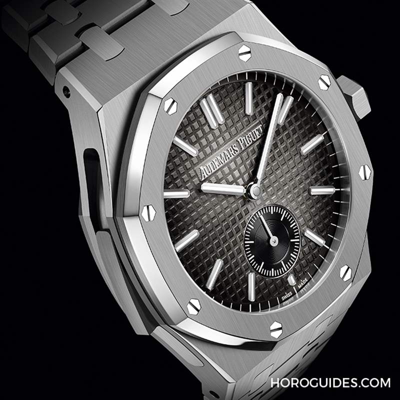 42毫米的皇家橡樹超問表采用鈦金屬表殼及表帶,兩者皆經(jīng)霧面打磨與亮面拋光交錯處理。煙熏灰色「Grande Tapisserie」大型格紋表面富層次感,漸變灰色調(diào)向外逐漸加深,至外緣幾近黑色,與表殼及表帶共同造就高雅大方的單一色調(diào)設計。深色表面配以螢光涂層白金立體時標及皇家橡樹指針,更加醒目易讀。設于6點鐘位置的黑色小秒針盤與黑色內(nèi)表圈互相呼應,其蝸紋裝飾則與「Grande Tapisserie」大型格紋圖案形成對比。