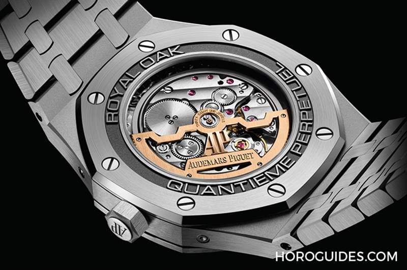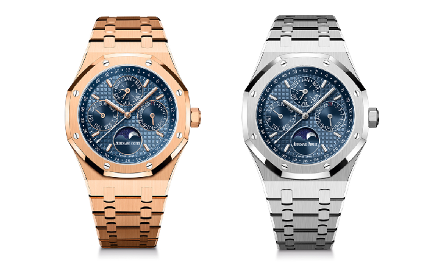 兩款皇家橡樹萬年歷腕表的「Grande Tapisserie」大型格紋表面上有四個小表盤整齊排列四方,配置平衡對稱,提供周數、星期、日期、月相、月份及閏年顯示功能,皇家橡樹指針則顯示小時及分鐘。表殼直徑41毫米,厚度僅有9.5毫米,相當纖薄。兩款表殼皆經手工霧面打磨與亮面拋光交錯處理,搭配相同材質的表帶及AP字樣折疊扣。