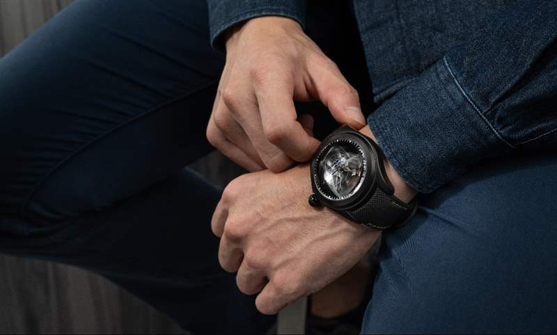 為配合表盤設計,復合材質表帶也以螢光綠色縫線縫制,配色一氣呵成。表帶內層為橡膠材質,配戴效果兼具舒適與耐用。