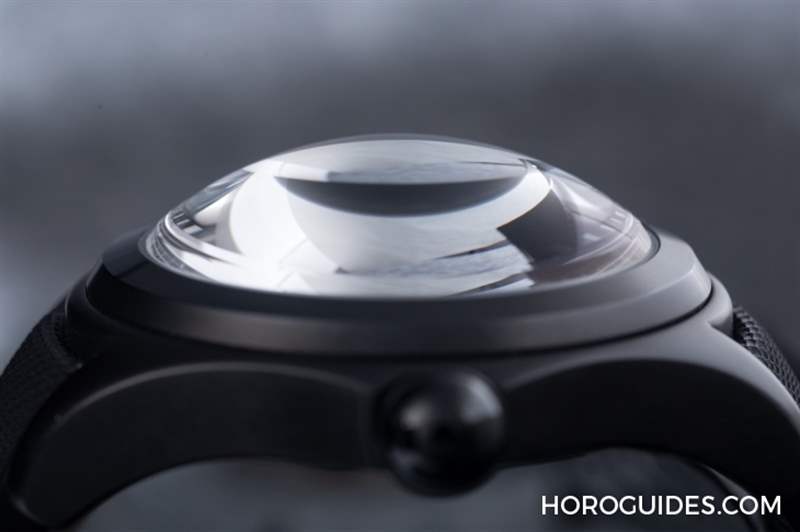 除了表盤圖案大膽吸睛,整個側面線條也深具看點。藍寶石水晶表鏡高高拱起的渾圓弧度,純凈透明,閃耀晶亮,恰與黑色PVD涂層表殼與表圈的啞光黑色,形成絕對對比,鮮明爽俐。整個表殼結構,以帶有圓弧感的線條勾勒成形,表殼側面以偌大的半球形表冠為中心,分別朝兩邊拉出猶如海鷗展翅翱翔的M形線條,并一路延伸至表耳;這兩道流暢的弧度,為表徑達47mm的表殼延伸出可更為貼合配戴者手腕的和緩曲線。