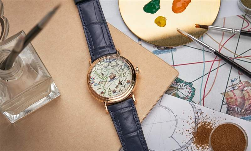 所謂的琺瑯是由晶體與金屬氧化物構(gòu)成,呈彩色顆粒狀。琺瑯工藝的程序是,先將之研磨成精細(xì)粉末,隨后加工成類似顏料的釉彩,并依次著色。先在表盤覆上背景釉彩,再依序勾繪表盤上的圖案,陸地的輪廓飾以金色琺瑯粉末,隨后是船只、動(dòng)植物和風(fēng)向玫瑰羅盤圖案等裝飾細(xì)節(jié),采用極為細(xì)致的微繪技藝,勾勒出豐富的細(xì)節(jié)和漸變色澤。這些細(xì)膩的色彩由琺瑯大師反覆調(diào)配而成,每上一次色都需要再次燒制,因?yàn)楝m瑯中的礦物質(zhì)在高溫融化后,才能煥發(fā)出獨(dú)特而富有層次感的光澤。
