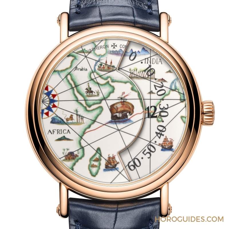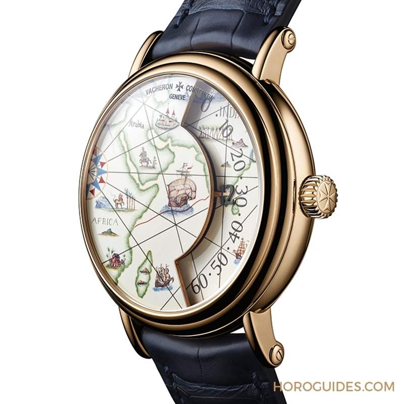 表盤上的地圖圖案,得自1519年繪制的《米勒地圖集》(Miller Atlas),其手繪復(fù)刻版現(xiàn)存于葡萄牙里斯本海事博物館內(nèi)。而三只表款上的地圖圖案系出自同一張地圖的不同位置,地圖中的紅色線條分別代表三位探險(xiǎn)家的航海行徑——皆聚焦在非洲與印度洋一帶,點(diǎn)出15~17世紀(jì)期間歐洲人探索世界的途徑。江詩丹頓采用微繪工藝在大明火琺瑯面盤上,重現(xiàn)地圖上細(xì)膩微妙的色彩和精美的圖案,從船只、城堡、動(dòng)植物到風(fēng)向玫瑰羅盤等,都一一重現(xiàn)在表盤上。