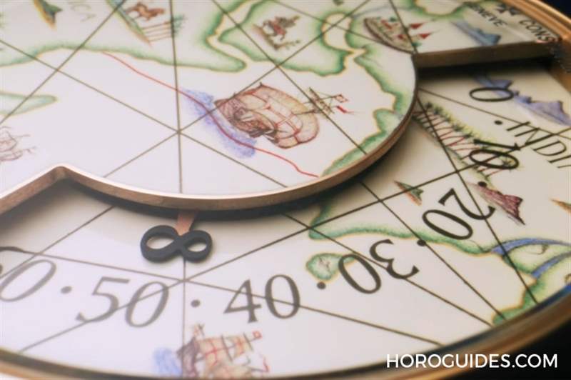 表盤以18K金打造,具有上下兩層結(jié)構(gòu),獨(dú)特的偏心式時(shí)間顯示——拖曳式小時(shí)、分鐘顯示,時(shí)間指示的區(qū)塊呈扇型并落在表盤右側(cè),為精湛的微繪工藝留出充裕的展示舞臺(tái),細(xì)膩描繪出一段探索世界的歷史篇章。