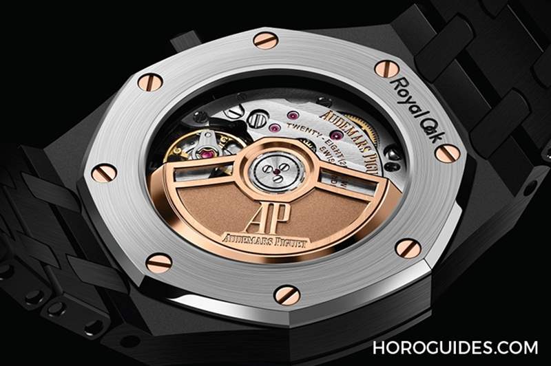 黑色陶瓷表款搭載5800自動上鏈機芯,這是去年專為34毫米皇家橡樹自動上鏈腕表而開發的機芯,提供50小時動力儲存,防水深度也達到50米。透過鑲嵌藍寶石水晶玻璃的鈦金屬底蓋,可欣賞該機芯的專屬玫瑰金自動盤及一部分精致裝飾。機手工精修裝飾秉承瑞士高級制表傳統,日內瓦波紋、粒面畫圈打磨、太陽紋和霧面打磨一應俱全。