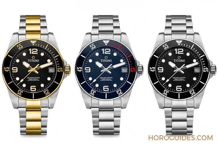 全新亮相的Titoni海洋探索600米,外型截然不同于前一代,單向旋轉(zhuǎn)表圈從鋁圈升級為高精密陶瓷圈,色澤飽和,刻度分明,帶來了更為鮮明閃耀的視覺效果;表圈加寬,整體風(fēng)格更顯朝氣。三種不同款式同步推出,包含:黃金海岸(雙色金配色)、潛水藍(lán)(藍(lán)面/藍(lán)色陶瓷圈)、馬里亞納黑(黑面/黑色陶瓷圈),集結(jié)了典型的潛水表元素,手感扎實有份量,表徑42mm的尺寸在展現(xiàn)豪邁與上手舒適性間取得了理想平衡,造型較前一代更形開闊大器。