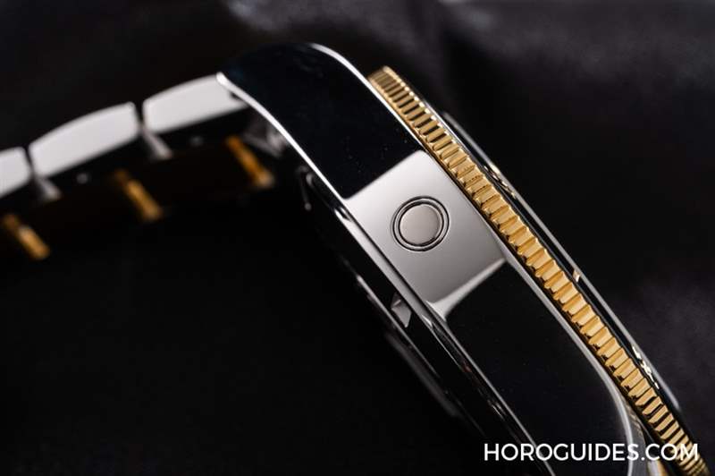 整體風(fēng)格陽剛俐落,細(xì)節(jié)到位。單向旋轉(zhuǎn)表圈邊緣乘鋸齒狀,既增加線條美感,同時可提高阻力以利旋動調(diào)整。表圈上的刻度與數(shù)字線條分明,配色對比,辨讀容易;其中藍(lán)面款的陶瓷外圈,呈現(xiàn)了藍(lán)、白、紅三種色澤,燒制程序更繁復(fù),制程難度更高。雙色金款則是利用金色PVD做出兩種精鋼呈色,表圈刻度與鋸齒邊緣、指針、時標(biāo)邊緣、表冠也都以金色與三板鏈帶的金色中央鏈節(jié)相呼應(yīng)。