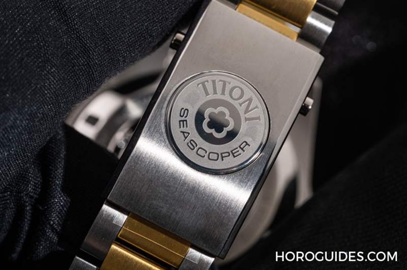 為方便腕表在平日與穿著潛水衣時都能配戴,不少潛水表都會采用快調(diào)帶扣裝置,以便徒手就能調(diào)節(jié)鏈帶長短。Titoni海洋探索600米當(dāng)然也少不了這項潛水表的基本配備,但向來著重實用又好用的Titoni,所做到的不只是求有,而且是做到更好—表帶帶扣上的Titoni梅花標(biāo)志,暗藏玄機(jī),一壓就能直接調(diào)節(jié)鏈節(jié),瞬間伸縮鏈帶長度。這個便利性極佳的設(shè)計,使用起來很直覺,操作手感無比順暢,十分爽俐。