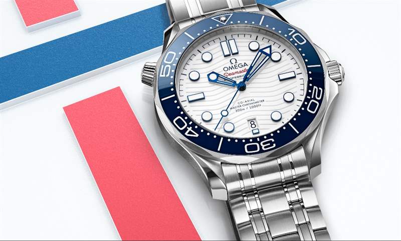 表徑42mm的不銹鋼表殼搭配藍(lán)色陶瓷表圈環(huán),整體呈現(xiàn)白、藍(lán)、銀色的色彩組合,位在12點鐘下方的「Seamaster」紅色字體,精巧又亮眼地點出此表款深具「潛」力的堅實內(nèi)涵,與東京奧運會徽相互呼應(yīng)。表圈環(huán)上設(shè)有白色琺瑯潛水刻度,邊緣線俐落、發(fā)色鮮明,識讀清晰。拋光白色陶瓷表盤以鐳射鐫刻波浪圖案,創(chuàng)造出饒富深邃感的裝飾效果;藍(lán)色時標(biāo)及指針均涂覆白色Super-LumiNova超螢光涂層。表殼與鏈帶皆交錯飾以拉絲紋與鏡面拋光。