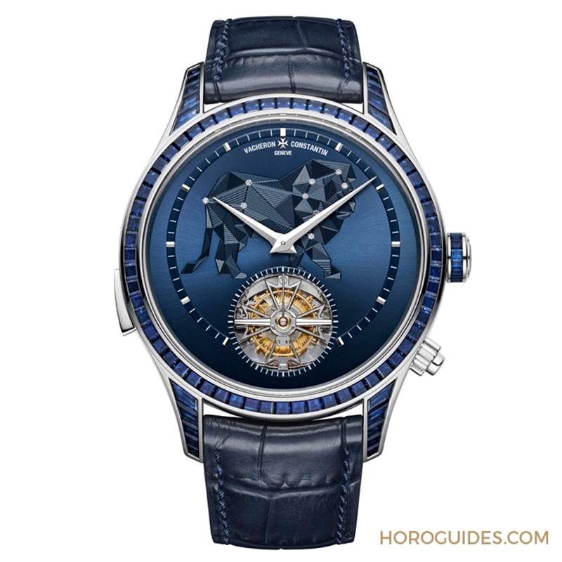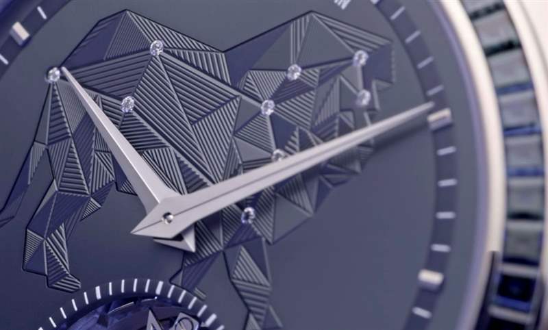 既然把目光投向了宇宙,自是不會遺漏了締造了諸多神話與傳說的星座;出現在夏季的獅子座,躍上「閣樓工匠三問報時陀飛輪星空圖獅子座珠寶表表盤,為這款杰作定調出優雅的王者風范。江詩丹頓以三角形圖案機刻雕花,在乳光深藍色表盤上拼列成獅子輪廓,羅列其間的鉆石鑲嵌正是構成這個星座的恒星。表殼鑲嵌100顆梯形切割藍寶石,深藍的折射光燦與表盤相映生輝。
