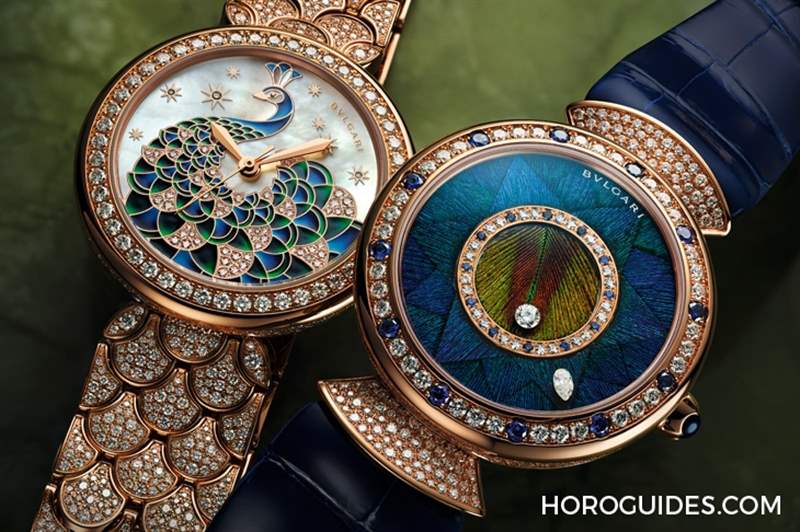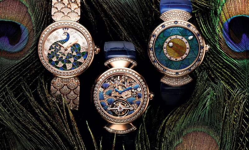 限量50只的Divas’ Dream Peacock Dischi 腕表以天然孔雀羽毛妝點(diǎn)鑲嵌表盤。表盤中央的圓點(diǎn)設(shè)計(jì),是取材自精挑細(xì)選后的孔雀羽毛「眼睛」花紋;透過(guò)黏合、裁剪、組合做出周圍的馬賽克鑲嵌圖案。搭載BVLGARI自制BVL 308「dischi」自動(dòng)上鏈機(jī)芯,雙圓盤顯示小時(shí)與分鐘,以1 顆圓形明亮切割鉆石和1 顆梨形切割鉆石作為時(shí)針與分針。
