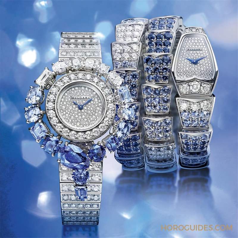 表徑26mm、18K玫瑰金材質的Serpenti Viper蛇形表殼,表盤與表圈共鑲嵌127顆圓形明亮式切割鉆石。表帶上則鑲嵌有黃色與綠色的石榴石、橙色的錳鋁榴石,以及藍、紫、黃、橙、與粉紅等色澤的藍寶石,順著表帶漸次鋪鑲成一道奪目的彩虹光芒。冰藍版則是采18K白金材質,以深淺不等的藍寶石與白鉆鑲嵌出漸層色感;另一方面,Serpenti Incantati也同步推出冰藍版配色,環飾著表殼的抽象蛇形,由12點鐘方向朝6點鐘位置顏色漸深濃,以多種切割的大克拉數藍寶石與鉆石帶出精致絕美的漸層感冰藍色。