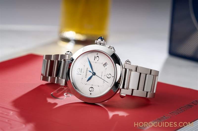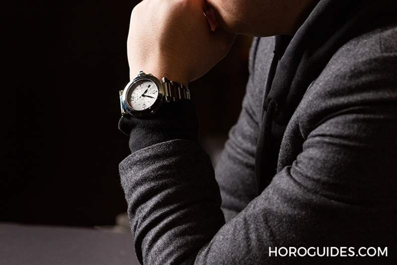 我手上這一只Pasha,我相信如果你有收藏手表一陣子的話也認識它,全新上市,41mm尺寸的,它的面盤是白色琺瑯、做一個放射線、做稍微的切割,面盤41mm是比較大,我覺得這樣綜合起來讓它有一個非常漂亮的面盤,因為它本身的設計其實是跟卡地亞傳統的Tank或是Santos,比起來設計是比較大膽,它是當初1985年卡地亞希望設計一款更年輕、更大膽的表款給比較年輕世代的朋友,他特別找來Gerald Genta,也就是Royal Oak、Nautilus很多傳奇表款的設計師,設計了這一款Pasha,我剛講它的面盤是一個很漂亮的白色,圓形的表圈,中間有個方形,卡地亞非常知名的軌道,所以你可以隱約的在一個很不同、很大膽的設計下看到各種卡地亞的特質,藍色的寶劍指針,搭配上這次是阿拉伯數字,卡地亞傳統用羅馬數字的比較多,這一次比較不一樣的,它用比較大一點的數字,然后在3、6、9、12方向有時標,當這個面盤、秒針在走的時候,背后的白光配上藍色的指針,細膩一點點卡地亞的特質,讓我看這款表的時候會讓我心情非常好。