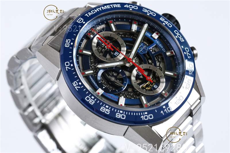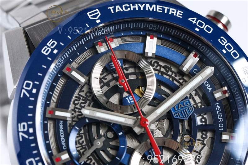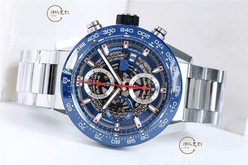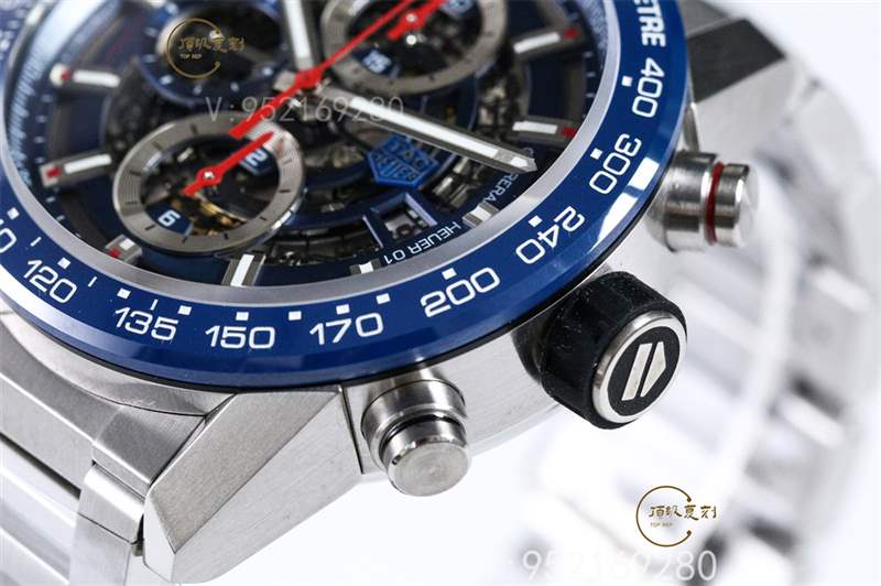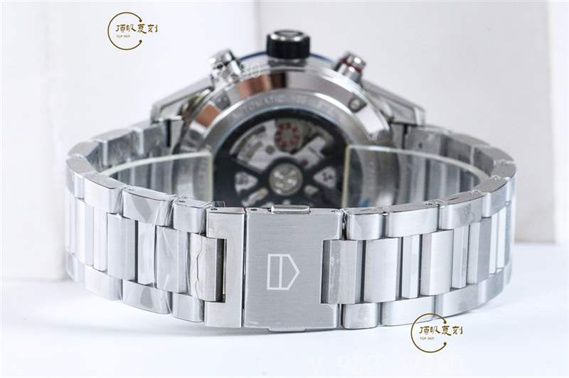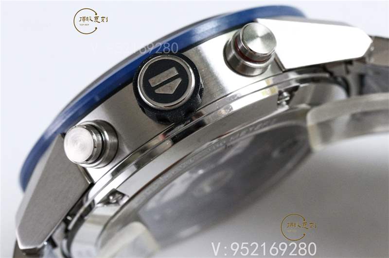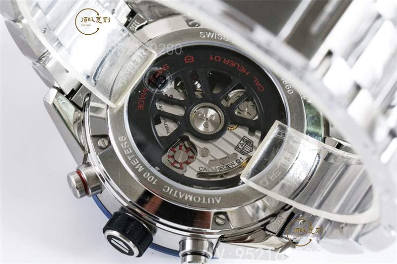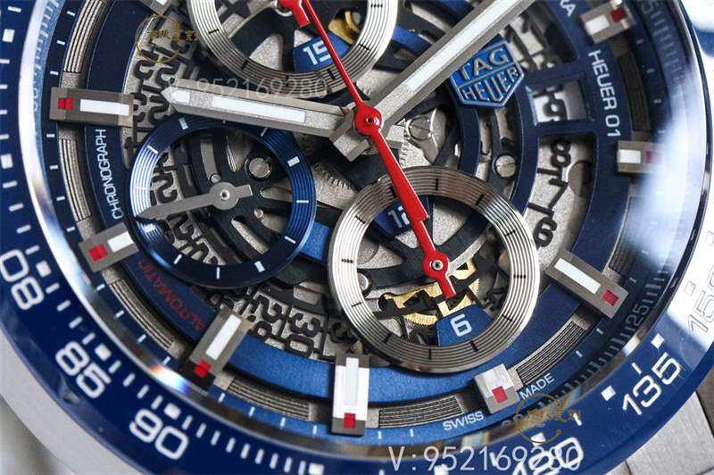 第四點,至于盤面細(xì)節(jié),還是保持了之前所有豪雅卡萊拉的優(yōu)秀基因。藍色外緣壓印60秒/分鐘刻度,交替處理飾面的鍍銠鑲貼時標(biāo),涂有白色superluminova?熒光涂料;帶交替處理飾面的鍍銠時針和分針,涂有白色superluminova?熒光涂料;紅色中央指針,鍍銠拋光鑲貼TAG HEUER(泰格豪雅)標(biāo)志,壓印“CARRERA HEUER 01 CHRONOGRAPH AUTOMATIC”字樣。藍色鏤空表盤典雅且極富動感,12 點鐘位置設(shè)有分鐘計時盤,6 點鐘位置設(shè)有小時計時盤,9 點鐘位置設(shè)有秒鐘計時盤。因為機芯的緣故,所有xf廠的豪雅卡拉來的日歷都是與正品的轉(zhuǎn)動方向相反,這個很難察覺。
