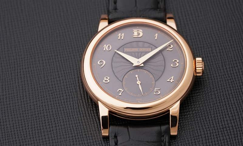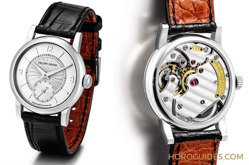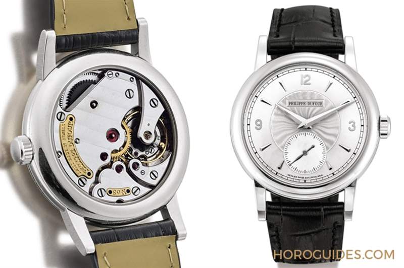 這件拍賣編號(hào)2152的拍品是首度被釋入拍場(chǎng),委售者向Philippe Dufour親自購(gòu)入,表盤中心飾以索紐紋,副表盤小為白色漆面,采用太子妃指針,機(jī)芯飾以日內(nèi)瓦波紋。