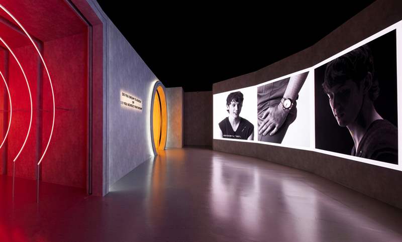 一走入展場,馬上就能領(lǐng)略到這個展覽的不一樣,兩個不同的入口-「方中帶圓:成就夢想」以及「圓中帶方:夢想成功」隧道,讓參觀者自行選擇,人生就像是一場不斷做選擇的歷程,每一個決定都左右著你即將通往的方向。邁入彩色燈管所串連起的光束隧道后,呈現(xiàn)在眼前的是一個以Pasha da Cartier的設(shè)計(jì)元素所構(gòu)筑的世界,方中帶圓貫穿全場,頻頻出現(xiàn)的鏡面讓人聯(lián)想到Pasha da Cartier渾圓表殼的講究拋光,閃亮如鏡。