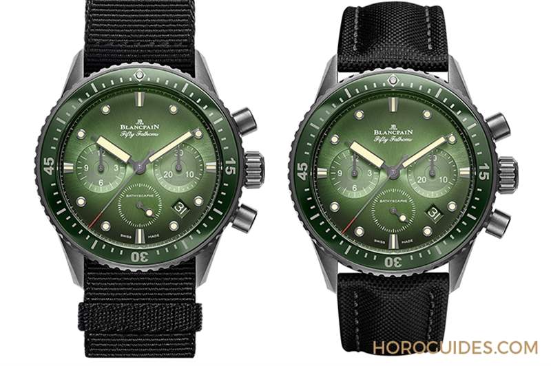 背面可透過藍寶石水晶底蓋看見寶珀F385自動上鏈機芯,跳動頻率為5 Hz,可將每秒分為10個間隔,保證了更高的準確性。配備垂直離合器和由導柱輪控制的計時結(jié)構(gòu),具有飛返功能,只需按下位于4點位置的按鈕,即可將計時器歸零并瞬即重啟。新款五十噚Bathyscaphe深潛器飛返計時腕表采用43.6毫米緞面磨砂黑色陶瓷表殼,旋轉(zhuǎn)表圈注入綠色陶瓷,并配以NATO或帆布表帶。