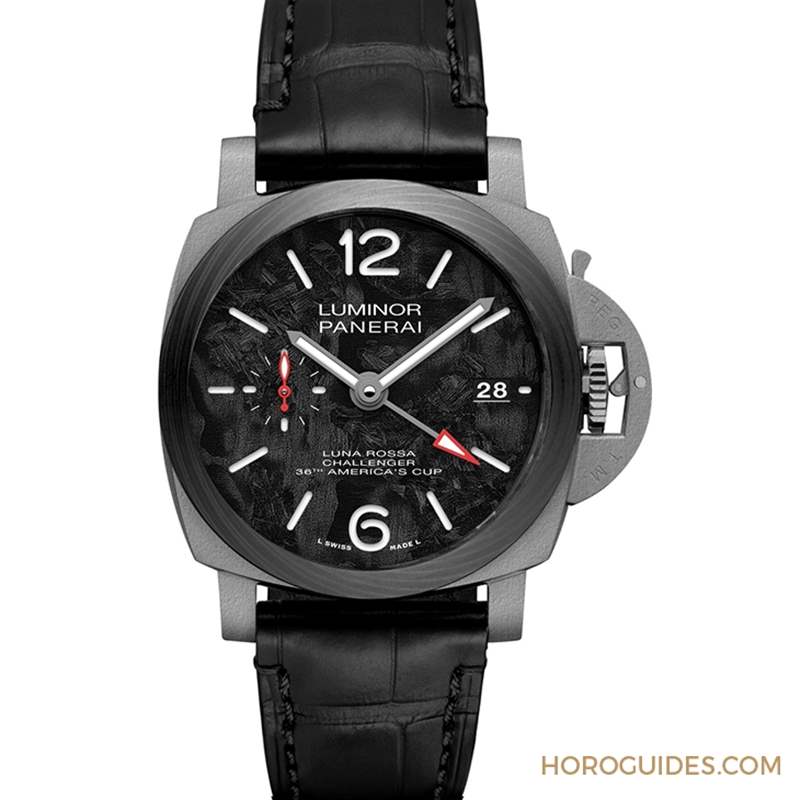 這款腕表的表盤上印制的相關(guān)字樣和鈦金屬表背鐫刻的特制圖案,呼應Luna Rossa船隊特色,如Luna Rossa船隊與Prada的紅色標志,這一標志性配色也出現(xiàn)在Luminor Luna Rossa GMT腕表的小秒針和GMT指針末端的三角箭頭上。