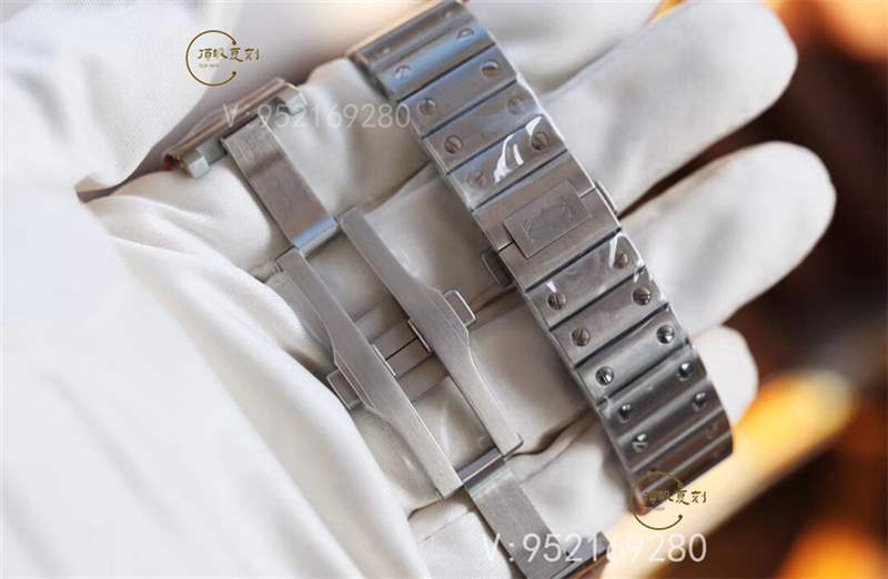 BV廠卡地亞山度士表帶,筆者認為BV廠此款手表做工最為神似的就是表帶的工藝,帶面44顆螺絲工整,且順暢無阻,并裝置Smartlink、Quickswitch快速拆卸裝置。