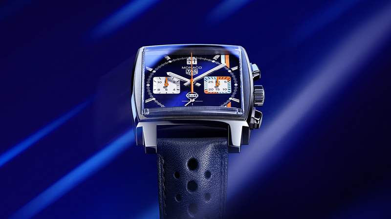 在摩納哥歷史性大獎賽之際,TAG Heuer(泰格豪雅)傳統上推出了一款摩納哥,上面印有參與賽車界的知名石油公司的顏色。今年,摩納哥海灣特別版的夜光藍色表盤及其拉絲旭日紋飾面,并謹慎使用綠松石和橙色。它們可以在兩條偏離中心的細平行條紋上找到,并在位于3點鐘位置的計數器上交替出現。標志性的39毫米方形精鋼表殼展現出這種美學構圖,其防水深度達到100米。為了強調驅動這款時計的競爭精神,在12點鐘位置,60鑲嵌物增添了一絲獨創性。