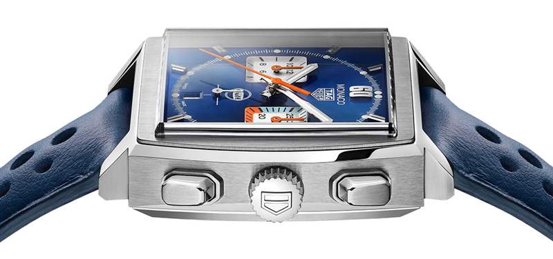 所有指針,包括小時指針、分鐘指針、低調小秒針、彩色時間間隔指針,以及位于6點鐘位置的日期指針,均由現代豪雅02型機芯精心打造。這款高性能自動上鏈機芯提供80小時的動力儲存。藍寶石表底蓋的設計讓觀眾能夠看到168個組件中的一些。計時碼表的橙色導柱輪、擺輪和風格化的擺陀也顯露出來。摩納哥海灣特別版強化了其復古運動個性,搭配帶橙色襯里的穿孔藍色小牛皮腕帶,并配有折疊式搭扣。