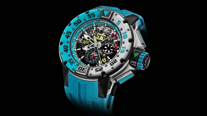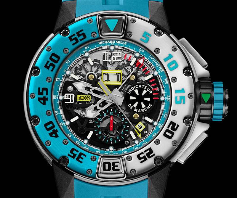 而且,雖然它符合ISO 6425標(biāo)準(zhǔn),但這款理查德·米勒(Richard Mille)創(chuàng)造的時計(jì)不僅僅是一個潛水員。其鏤空表盤炫耀著幾只指針,包括時針和分鐘指針以及飛返計(jì)時碼表。紅色指針表示秒針,黃色指針表示觸發(fā)計(jì)時的分鐘數(shù)。6點(diǎn)鐘位置的計(jì)數(shù)器將時間累加。每分鐘2轉(zhuǎn)的旋轉(zhuǎn)動力儲存指示器讓佩戴者知道該機(jī)制工作正常。這些數(shù)據(jù)由12點(diǎn)鐘位置的大尺寸日期和4點(diǎn)30分的月窗組成,兩者均具有半瞬時顯示功能。所有數(shù)據(jù)均由RMAC2機(jī)芯以極高的精度驅(qū)動。這款自動上鏈機(jī)芯憑借其可變幾何擺陀和雙發(fā)條盒以及其他元素脫穎而出。其架構(gòu)旨在提供約50小時的連貫動力儲存。