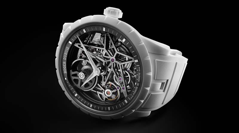 Excalibur MCF Blanc腕表是羅杰杜彼探索各種材料使用的延續(xù)。2020年,該品牌推出了Excalibur Twofold,其外殼具有由礦物復(fù)合纖維MCF制成的特殊性。這種99.95%二氧化硅的材料是制表技術(shù)中的第一。它因其超白顏色和抗侵略性紫外線而特別有吸引力。其相當(dāng)輕的重量,比碳少13%,使其同樣具有吸引力。由非常穩(wěn)定的樹脂制成,加工起來要容易得多。憑借這種美學(xué)和實用品質(zhì),在日內(nèi)瓦制表師的作品中找到MCF的可能性很高。因此,它應(yīng)該形成這個新的88枚限量系列腕表Excalibur MCF White的42毫米直徑表殼,這是很自然的。