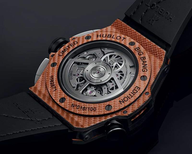 Big Bang Unico Golf Orange Carbon的所有功能繼續(xù)由MHUB1580機芯提供動力。這款自動上鏈機芯可提供72小時的動力儲存。足以陪伴您整個周末的18洞球場!
