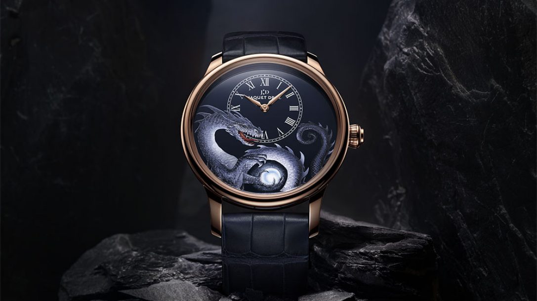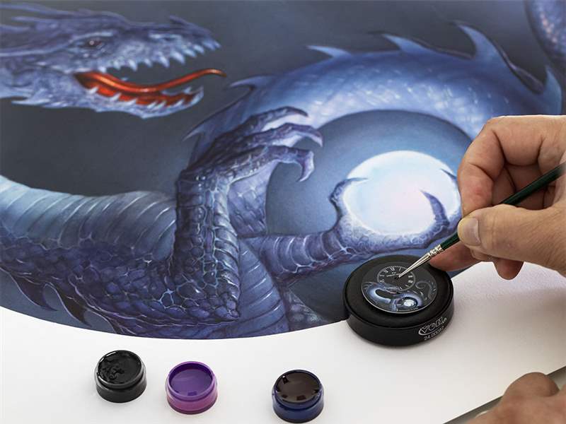 約翰·豪(John Howe)是《指環王》三部曲的藝術總監,由彼得·杰克遜(Peter Jackson)改編為大銀幕,為J.R.R.托爾金小說中的龍注入了生命。這種神奇的爬行動物生物也出現在許多神話和傳說中。雖然它在歐洲被描繪成敵對的,但它在亞洲被廣泛崇拜。雅克德羅(Jaquet Droz)呼吁這位著名插畫家的才華,想象兩本18件的小說限量版《小赫尤爾分鐘龍》(Petite Heure Minute Dragon)。時計深藍色大火琺瑯表盤上的可用空間是完成一幅高度原創的微型畫的完美背景。而且,憑借其精致的特征,傳說中的動物在12點鐘位置偏離中心的小時和分鐘圓盤下伸展。得益于對浮雕、質地和光線的微妙發揮,工匠的做工為覆蓋著鱗片的身體注入了生命,這些鱗片具有無數的灰色細微差別。一顆珍珠,根據中國的象征意義,擁有許多美德,依偎在它的爪子里,照亮了單色的場景。