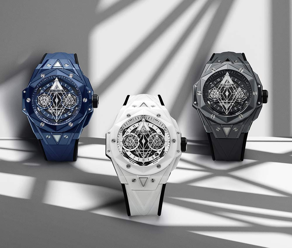 自2016年以來,由瑞士紋身藝術(shù)家兼創(chuàng)意總監(jiān)Maxime Plescia-Büchi和宇舶表創(chuàng)辦的著名雜志Sang Bleu建立了合作伙伴關(guān)系,旨在定期提出具有顛覆性設(shè)計(jì)的限量系列。每件作品都是基于直徑45毫米的大爆炸表殼的想象,該表殼具有重新詮釋的線條。今年,來自Nyon的制表師為Big Bang Sang Bleu II陶瓷三重奏注入了對(duì)材料的精湛技藝。顧名思義,這些時(shí)計(jì)的表殼采用陶瓷制成,陶瓷經(jīng)過著色,并以緞面拉絲和拋光表面襯托。但還有更多即將到來,因?yàn)榭堂媪切伪砣途牡窨痰谋肀P也是這種材料的中心舞臺(tái)!白色,藍(lán)色或灰色色調(diào)在這種風(fēng)格化的三維幾何場(chǎng)景設(shè)計(jì)中占據(jù)著至高無上的地位,其中令人驚訝的手,兩個(gè)錠劑和一個(gè)箭頭懸停在時(shí)間數(shù)據(jù)上。同樣,交織的線條確保小秒針和累加器從雙復(fù)合定位計(jì)時(shí)碼表中脫穎而出。