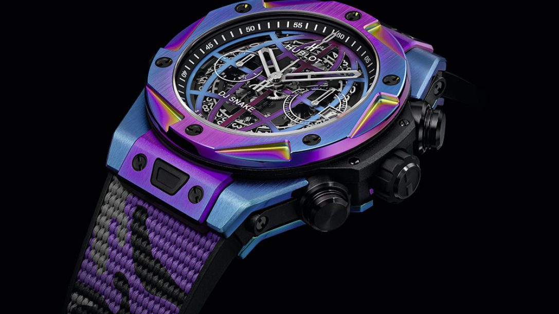宇舶表和DJ Snake自2018年1月1日起成為合作伙伴,當時他在俄羅斯FIFA世界杯期間主持宇舶表閉幕晚會的甲板。三年后,這一合作伙伴關系的第一款手表亮相:The Big Bang DJ Snake。大爆炸的標志性設計現在具有彩虹般的光澤,具有無數的藍色和紫色色調。45毫米表殼的表圈和六顆鈦金屬組件均采用特殊技術制造工藝處理,類似于黑色PVD處理。在此過程中,當腕表的不同組件涂有不同顏色時,必須分別放置在特定位置。結果是一種光學效果,其中手表的顏色根據光線和從不同角度觀看時而變化。不僅如此,在虹彩處理之前,零件的表面也硬化了,以提高其附著力。這是一項復雜的操作,因為在生產的100枚腕表中,很難獲得相同的顏色漸變。表圈外緣的切口由DJ Snake親自設計。這些缺口使Big Bang DJ Snake立即被識別出來,將其與其他系列區分開來。“融合藝術”哲學的例證,宇舶表如此珍視!