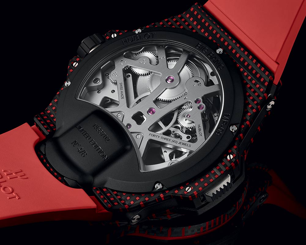每只MP 09陀飛輪雙軸3D碳纖維腕表僅由8枚組成。每一款腕表均搭配表殼的彩色橡膠表帶,搭配折疊式表扣。