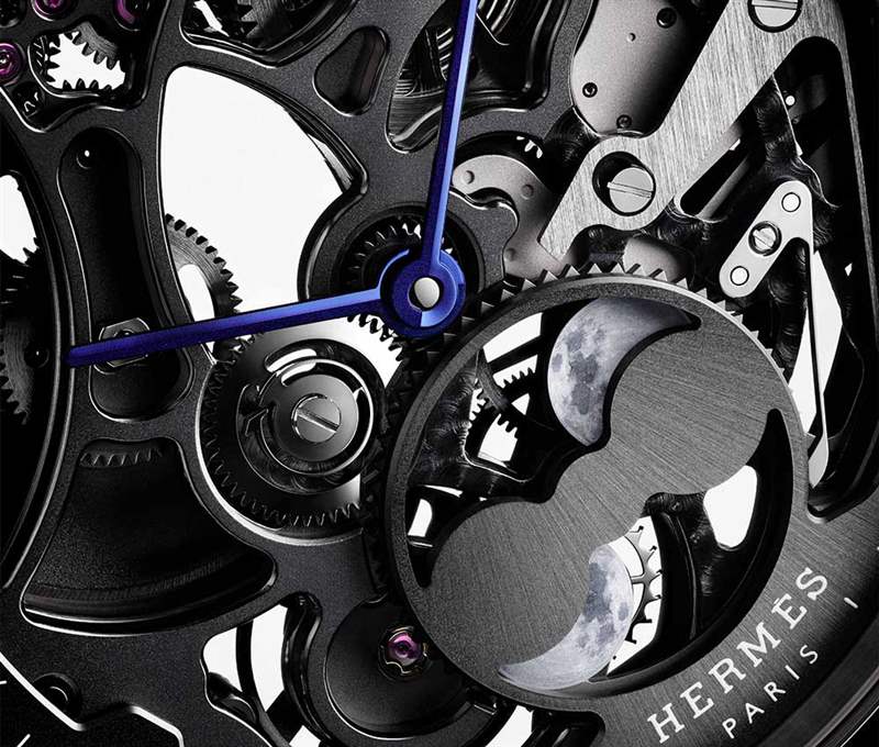 纖細的愛馬仕鏤空月亮腕表搭配啞光無煙煤鱷魚皮腕帶,搭配鈷色縫線和鈦金屬針式表扣。