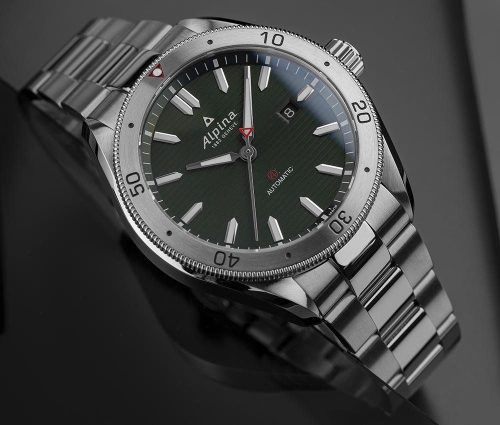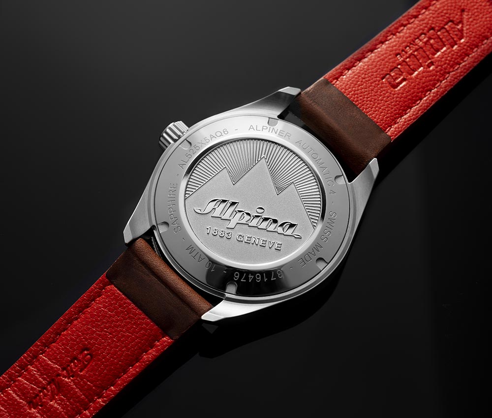 最新款A(yù)lpina表款搭配相同的44毫米和13.15毫米精鋼表殼,搭配雙向旋轉(zhuǎn)表圈,飾有黑色標(biāo)記和紅色三角形指示。這款堅固的表殼由堅固的表背固定,上面刻有三座山脈,可容納AL-525自動上鏈機(jī)芯,運(yùn)行頻率為4hz,可提供38小時的動力儲存。