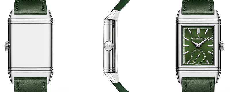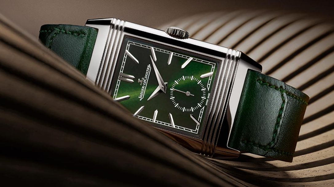 Reverso Tribute Small Seconds 腕表 搭配綠色小牛皮表帶,搭配由阿根廷定制靴制造商 Casa Fagliano 精制而成的表盤,積家樂庫爾特自 2011 年以來一直與之合作。
