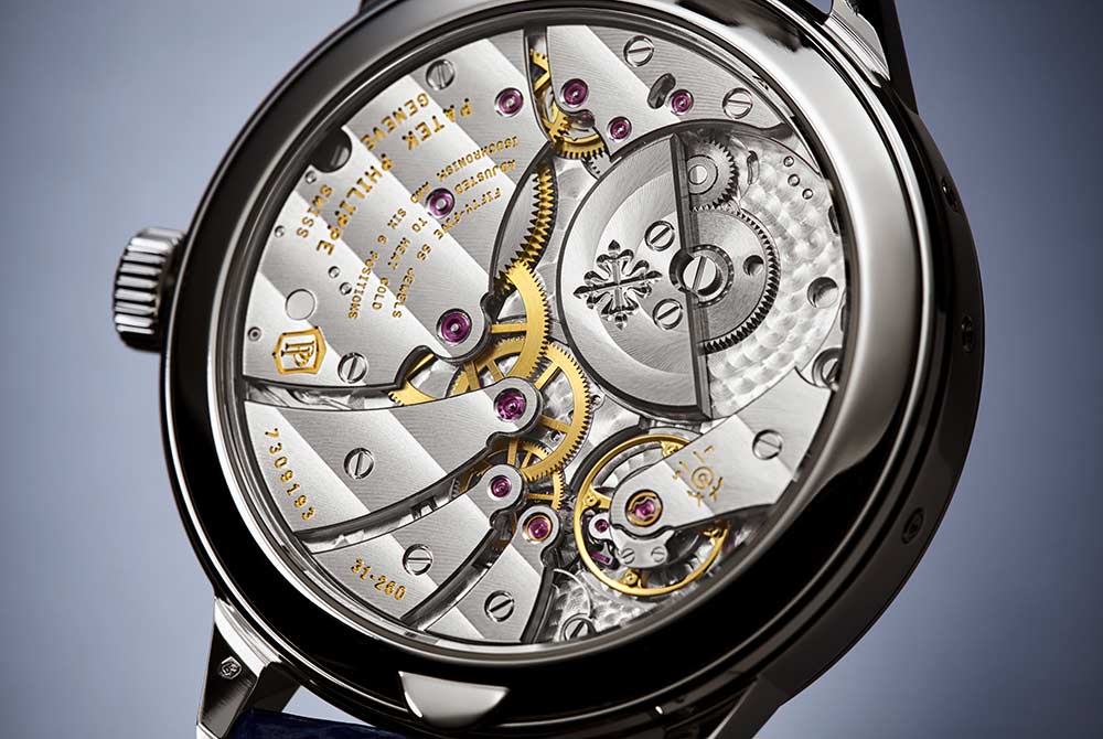 這款自動上鏈機芯鑲嵌在直徑41.3毫米的鉑金表殼中。它還驅(qū)動晝/夜指示器以及閏年,分別設(shè)置在位于4點鐘和8點鐘位置的兩個對稱圓圈中。在6點鐘位置,小秒針打開了月亮的相位。腕表的微型擺陀和裝飾橋板令人贊嘆藍(lán)寶石水晶玻璃表背。