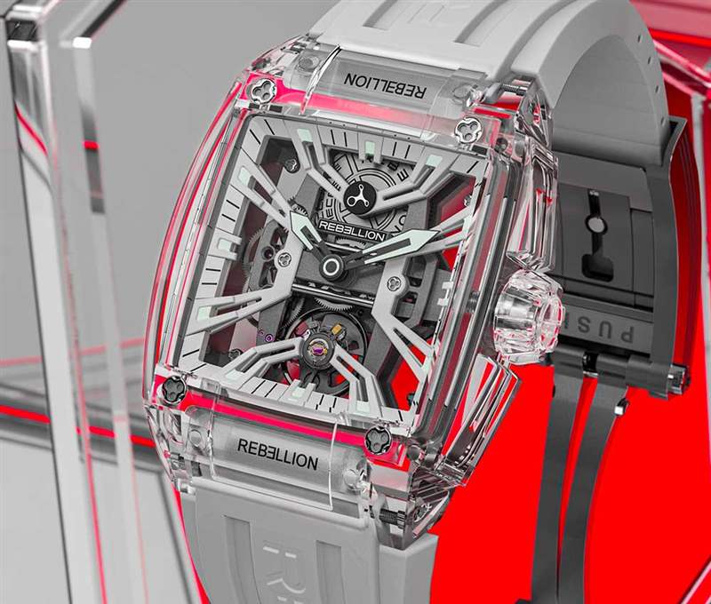 繼Magnum 540 Sapphire和令人難以置信的Weap-one鉆石不對稱陀飛輪之后,Rebellion首次推出了其RE-Volt表款,該表款專注于三種新穎的半透明表殼。所有產品均采用合成藍寶石制成,并強調透明度,以增強視覺情感。制表師們對細節的關注超越了極限,甚至以與表殼相同的材料制作了RE-Volt藍寶石的表冠。為這些獨家單品選擇的顏色毫不含糊地讓人聯想到那些在賽車世界中看到的顏色,這項運動對品牌來說永遠如此珍視。半透明的鏤空表殼和橋板直接在實心材料中著色,其雕塑般的輪廓就像超級跑車的車身一樣,有電藍色和激情紅色可供選擇。第三個版本,從頭到腳穿著白色,吸引了眼球。其色調的純潔性是鐘表最先進個性和分層場景設計的中心。