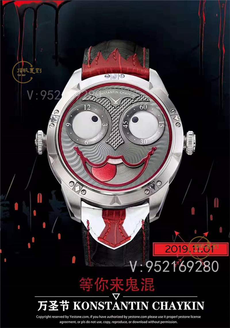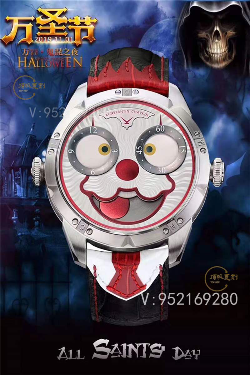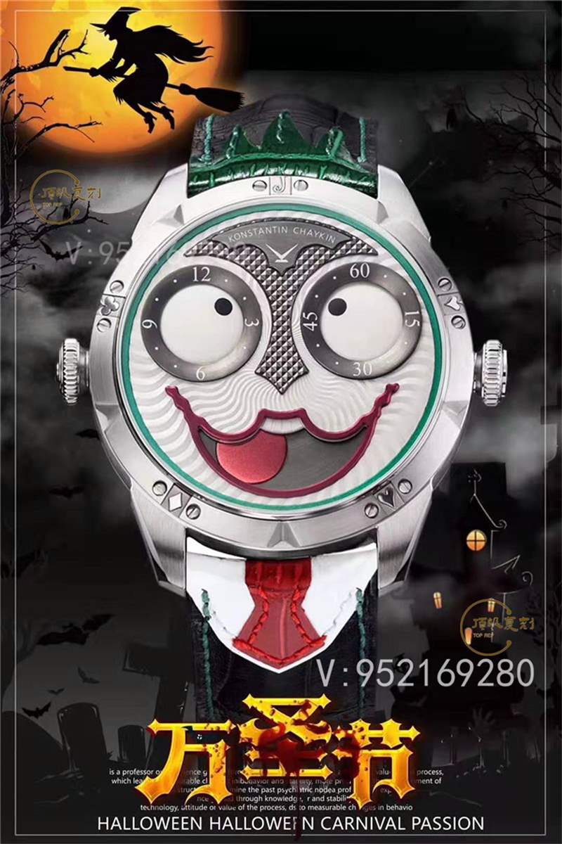 【技術突破】表盤表情神采不斷變化的小丑臉,轉動的眼睛,瘋狂的面容,和吐出的紅色舌頭,表情變化非常豐富,兩只眼睛分別為分鐘和小時的指示,月相顯示(笑臉),每天有2萬多種表情變化,幽默性質的獨特的設計元素