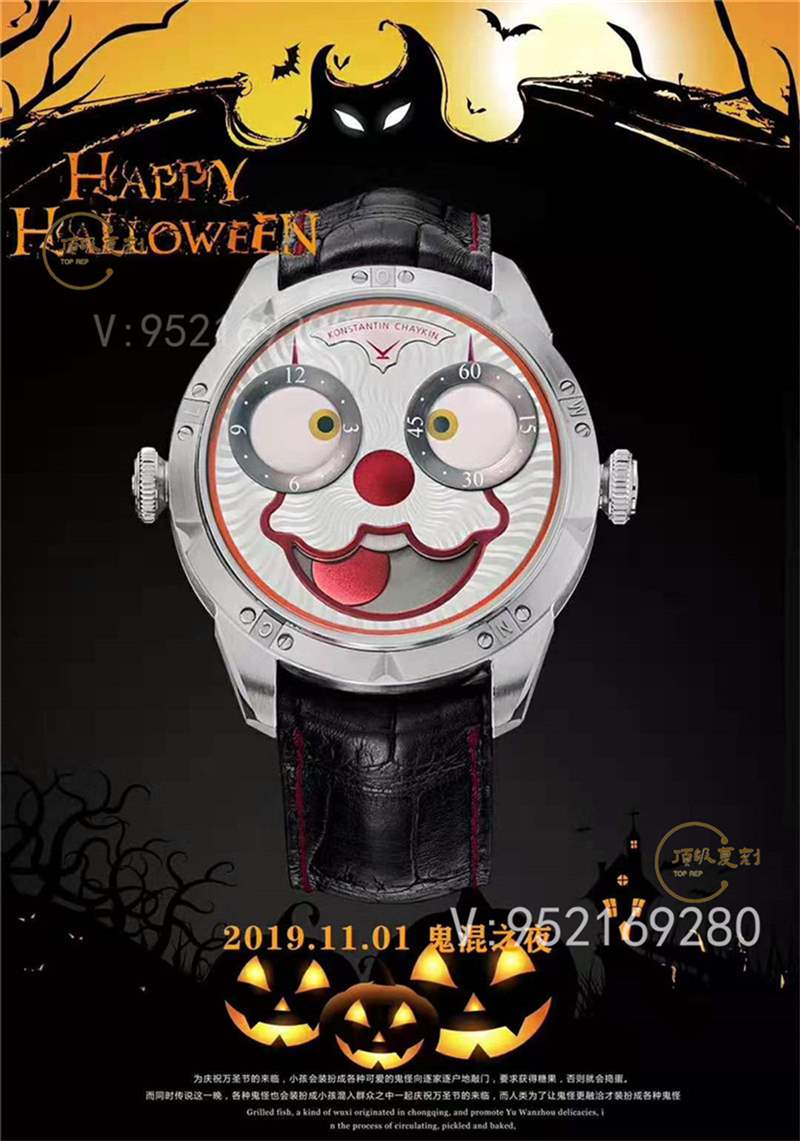然后我們再來放大看一下整個字面,其實這個字面你說簡單他也不簡單,整個字面由多種技術疊加,多種紋理相交織,靈魂刻畫的還原度極高。它有很多的浮雕在上面,而且很多的紋理非常的復雜。不單單只是外觀個性它的左右小表盤做為小丑的兩個大眼睛。左面為小時指針右面為分針指針,以黑色圓點(切金拿手的神秘時針技術)代替,隨時間的變化不斷轉動頑皮的小黑眼珠!然后大月相窗口正好是一張小丑的大大的裂開大笑的嘴巴。而上“嘴唇”的設計,和白色的“門牙”,正好起到遮擋月相轉盤、完成月相陰晴圓缺的作用。整個字面的設計任何人都會忍不住多看上兩眼。戴在手上,自然是所有目光的匯聚點。